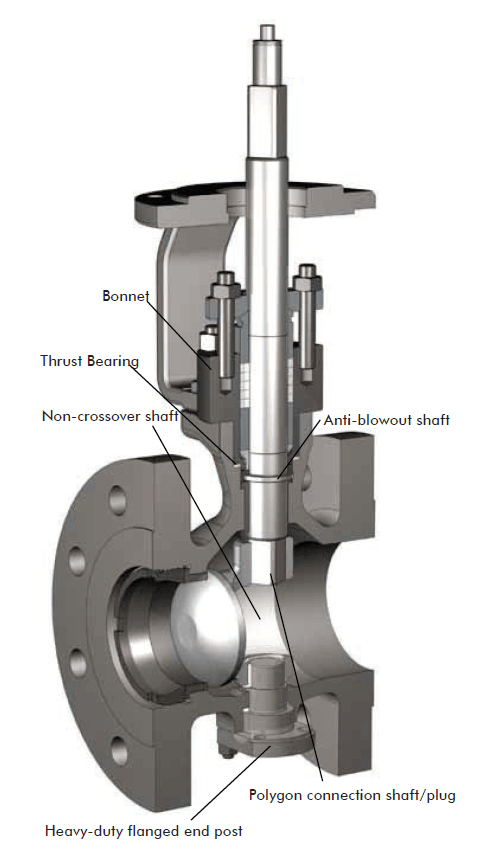 The EFlo offers positive, anti-blowout protection by means of a separate bonnet and integral shaft collar, as a standard option, emphasizing its status as the safest Eccentric Rotary Plug valve on the market. The end-post shaft is designed so there is no possibility for it to be lost downstream. The end-post is rugged, precision machined, perfectly aligned, and positively retained so movement is smooth and precise. The oversized shaft provides improved reliability and valve life by eliminating shaft failures and reducing bearing wear.