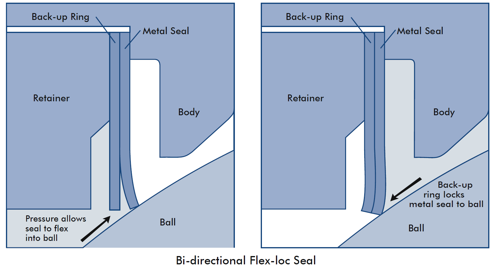 With an increased differential pressure, the sealing capacity is increased with flex-lock. With the pressure entering the cavity with the shaft downstream, the flexible seal deflects into the ball, and causes it to seal tighter against the ball. With pressure entering the cavity with the shaft upstream, the back-up ring locks the seal against the ball and causes it to seal tighter against the ball.